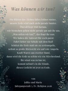 Gottes Schöpfung in Gefahr!? Mit diesem Thema beschäftigten sich die Schülerinnen und Schüler der Jahrgangsstufe 5 im Fach evangelische und katholische Religion. In einem Museumsrundgang betrachteten und bewerteten sie sich gegenseitig ihre Werke. Wir finden auch: